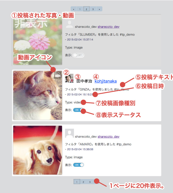 キャンペーンハッシュタグと@メンションまたはタグ付けされている写真・コメントを収集し、管理画面に表示します。