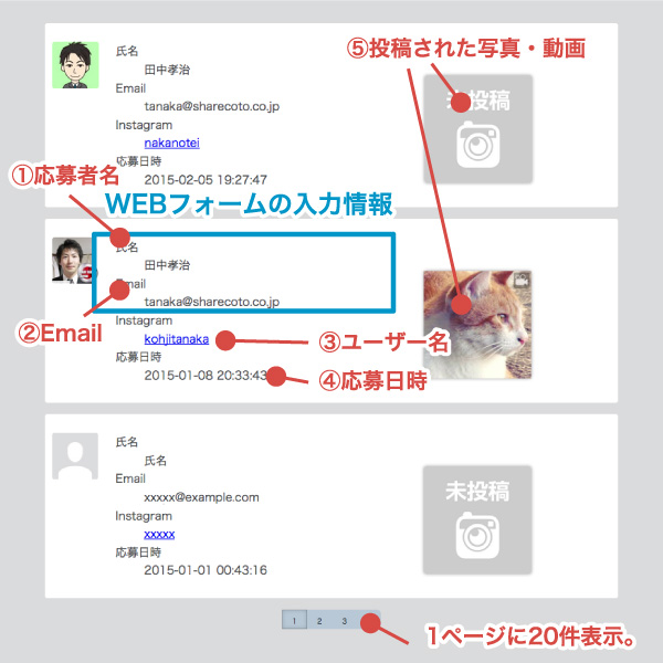 ※ハッシュタグが付いた写真・動画を収集し、含まれるInstagram IDを特定、下記の応募者情報と紐付けます。